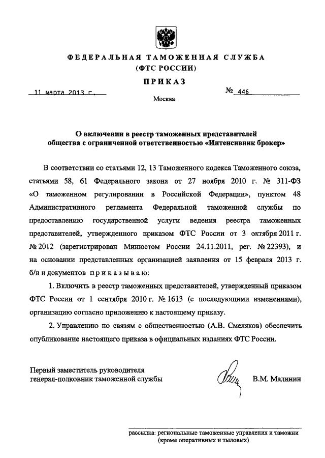 ПРИКАЗ ФТС РФ от 11.03.2013 N 446