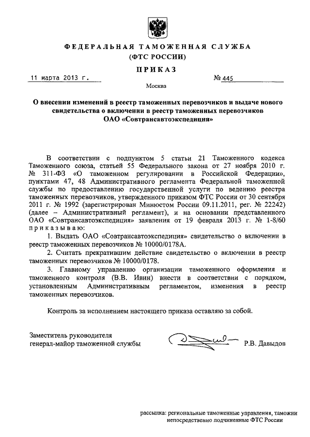 ПРИКАЗ ФТС РФ от 11.03.2013 N 445