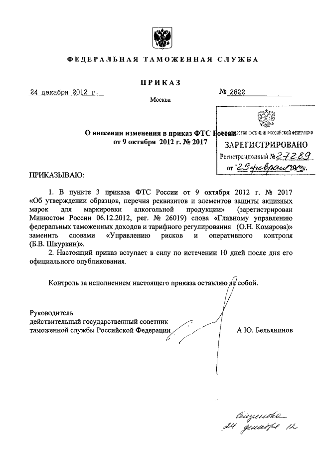 ПРИКАЗ ФТС РФ от 24.12.2012 N 2622