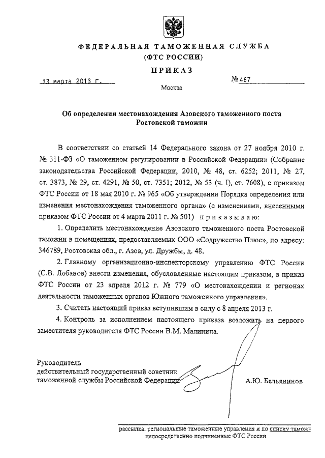 ПРИКАЗ ФТС РФ от 13.03.2013 N 467