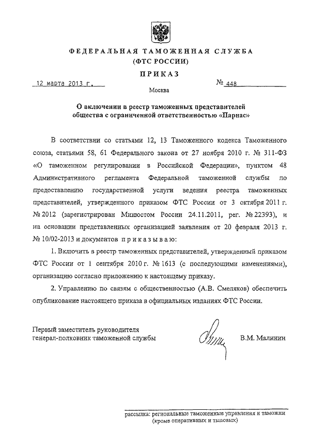 ПРИКАЗ ФТС РФ от 12.03.2013 N 448