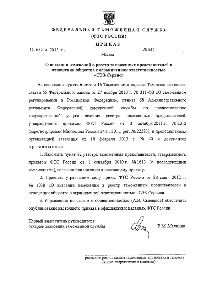 ПРИКАЗ ФТС РФ от 12.03.2013 N 449