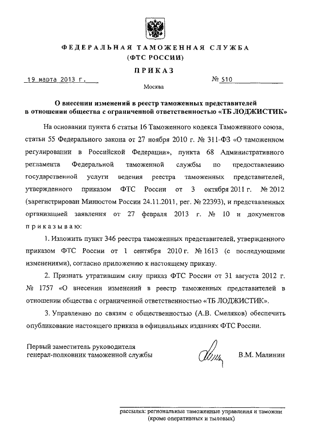 ПРИКАЗ ФТС РФ от 19.03.2013 N 510