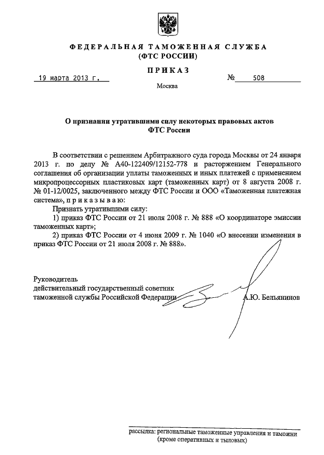 ПРИКАЗ ФТС РФ от 19.03.2013 N 508