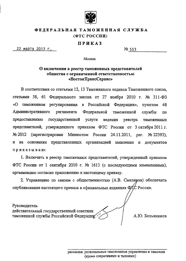 ПРИКАЗ ФТС РФ от 22.03.2013 N 553