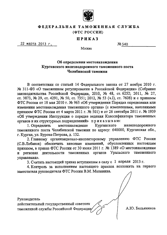 ПРИКАЗ ФТС РФ от 22.03.2013 N 540