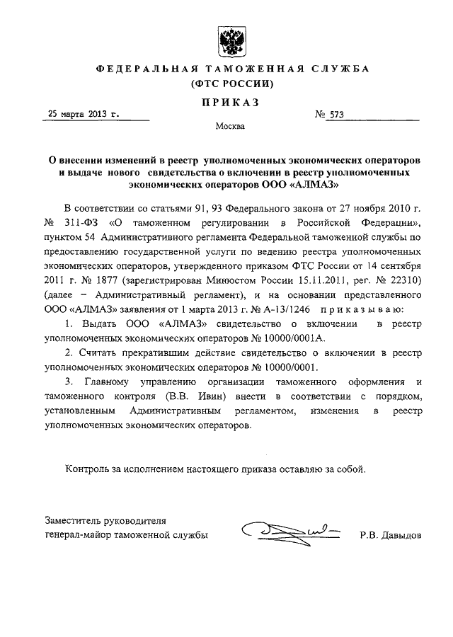 "О ВНЕСЕНИИ ИЗМЕНЕНИЙ В РЕЕСТР УПОЛНОМОЧЕННЫХ ЭКОНОМИЧЕСКИХ ОПЕРАТОРОВ И ВЫДАЧЕ НОВОГО СВИДЕТЕЛЬСТВА О ВКЛЮЧЕНИИ В РЕЕСТР УПОЛНОМОЧЕННЫХ ЭКОНОМИЧЕСКИХ ОПЕРАТОРОВ ООО "АЛМАЗ"