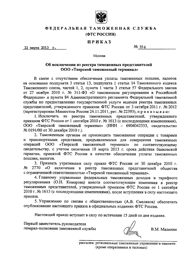 ПРИКАЗ ФТС РФ от 22.03.2013 N 556
