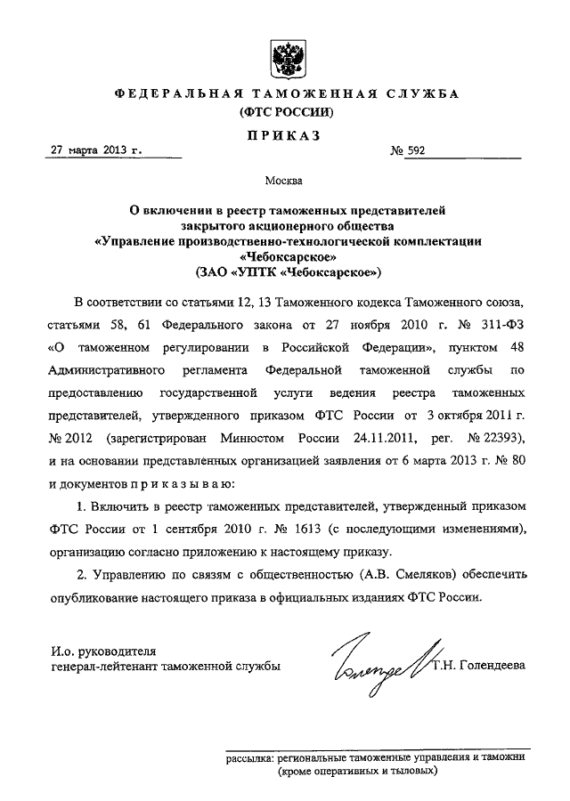 ПРИКАЗ ФТС РФ от 27.03.2013 N 592