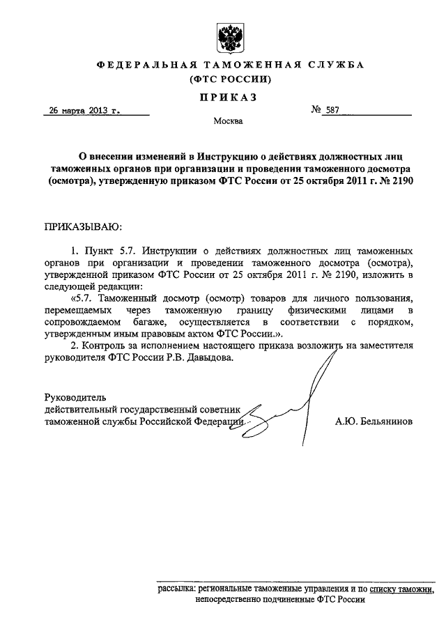 ПРИКАЗ ФТС РФ от 26.03.2013 N 587