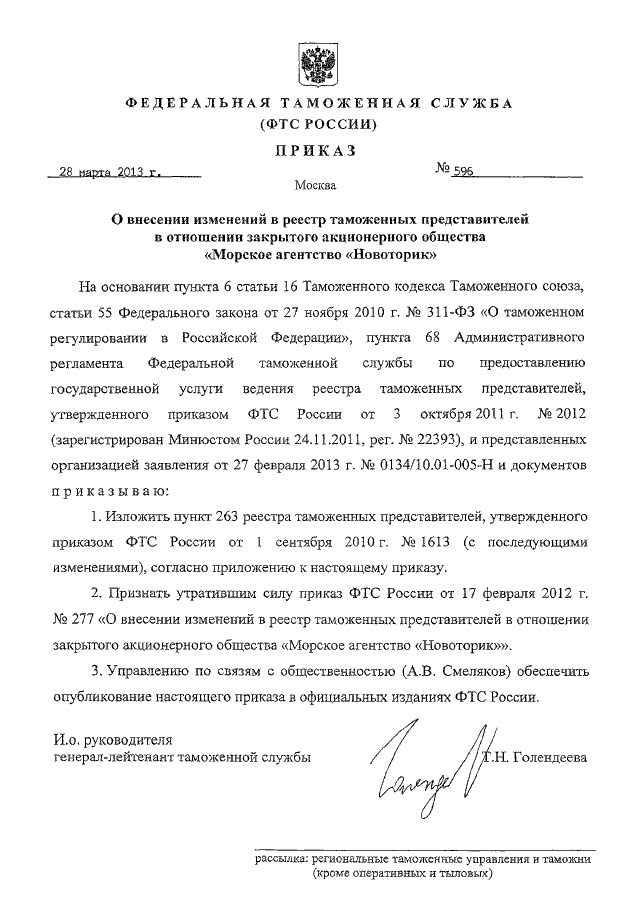 ПРИКАЗ ФТС РФ от 28.03.2013 N 596