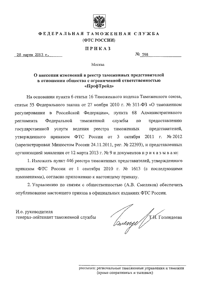 ПРИКАЗ ФТС РФ от 28.03.2013 N 598