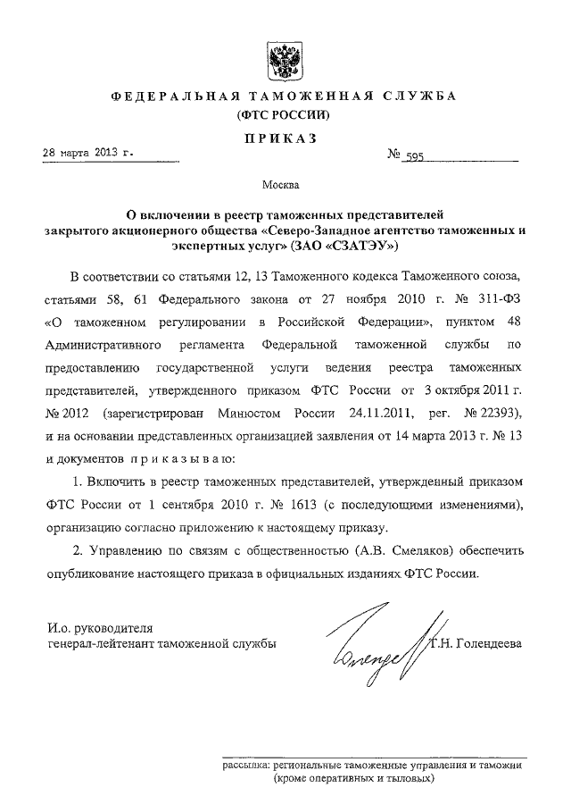ПРИКАЗ ФТС РФ от 28.03.2013 N 595