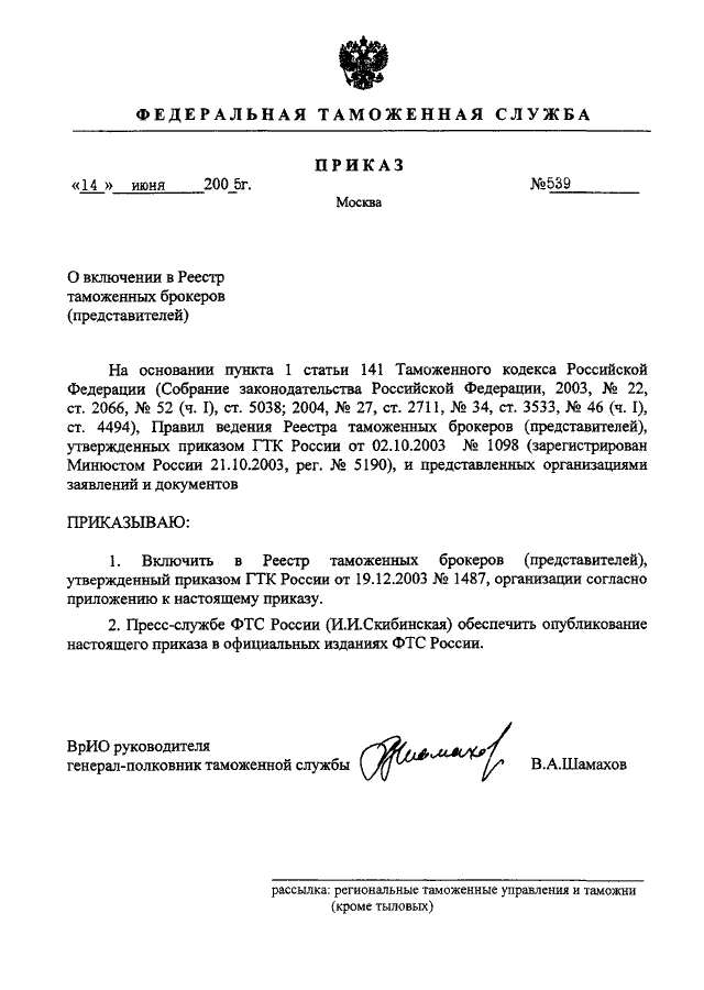 ПРИКАЗ ФТС РФ от 14.06.2005 N 539