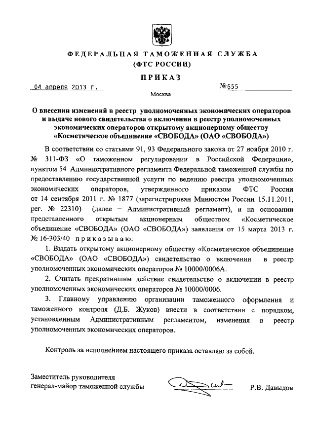 ПРИКАЗ ФТС РФ от 04.04.2013 N 655 "О ВНЕСЕНИИ ИЗМЕНЕНИЙ В РЕЕСТР УПОЛНОМОЧЕННЫХ ЭКОНОМИЧЕСКИХ