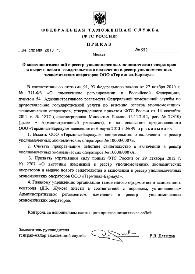 "О ВНЕСЕНИИ ИЗМЕНЕНИЙ В РЕЕСТР УПОЛНОМОЧЕННЫХ ЭКОНОМИЧЕСКИХ ОПЕРАТОРОВ И ВЫДАЧЕ НОВОГО СВИДЕТЕЛЬСТВА О ВКЛЮЧЕНИИ В РЕЕСТР УПОЛНОМОЧЕННЫХ ЭКОНОМИЧЕСКИХ ОПЕРАТОРОВ ООО "ТЕРМИНАЛ - БАРНАУЛ"