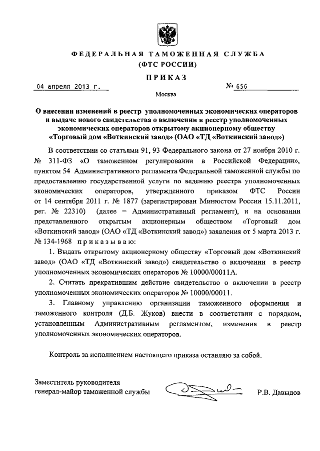 ПРИКАЗ ФТС РФ от 04.04.2013 N 656 "О ВНЕСЕНИИ ИЗМЕНЕНИЙ В РЕЕСТР УПОЛНОМОЧЕННЫХ ЭКОНОМИЧЕСКИХ