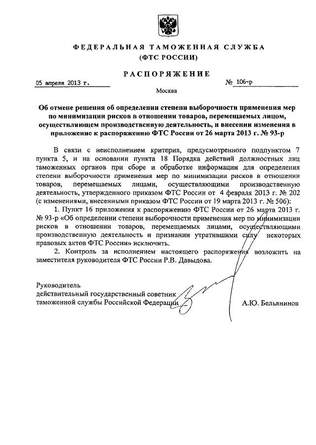 РАСПОРЯЖЕНИЕ ФТС РФ от 05.04.2013 N 106-р "ОБ ОТМЕНЕ РЕШЕНИЯ ОБ ОПРЕДЕЛЕНИИ СТЕПЕНИ ВЫБОРОЧНОСТИ ПРИМЕНЕНИЯ