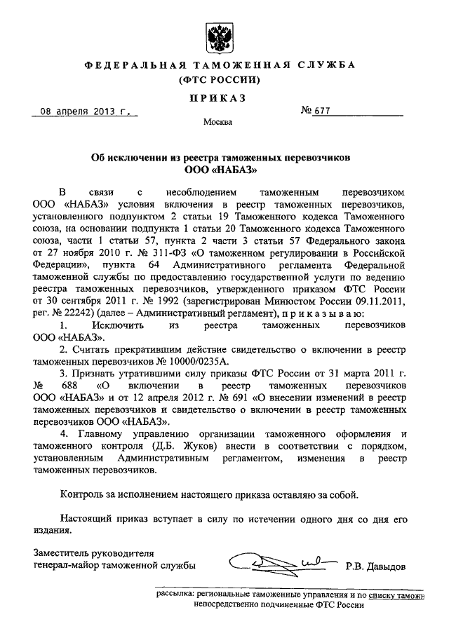 ПРИКАЗ ФТС РФ от 08.04.2013 N 677