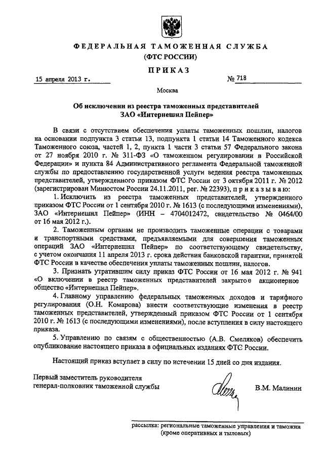 ПРИКАЗ ФТС РФ от 15.04.2013 N 718