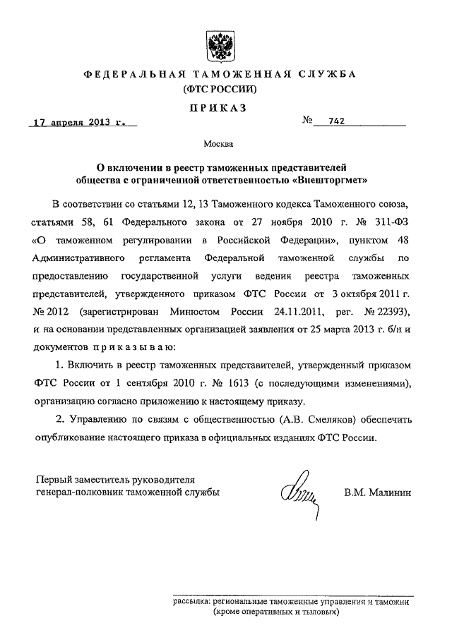 ПРИКАЗ ФТС РФ от 17.04.2013 N 742