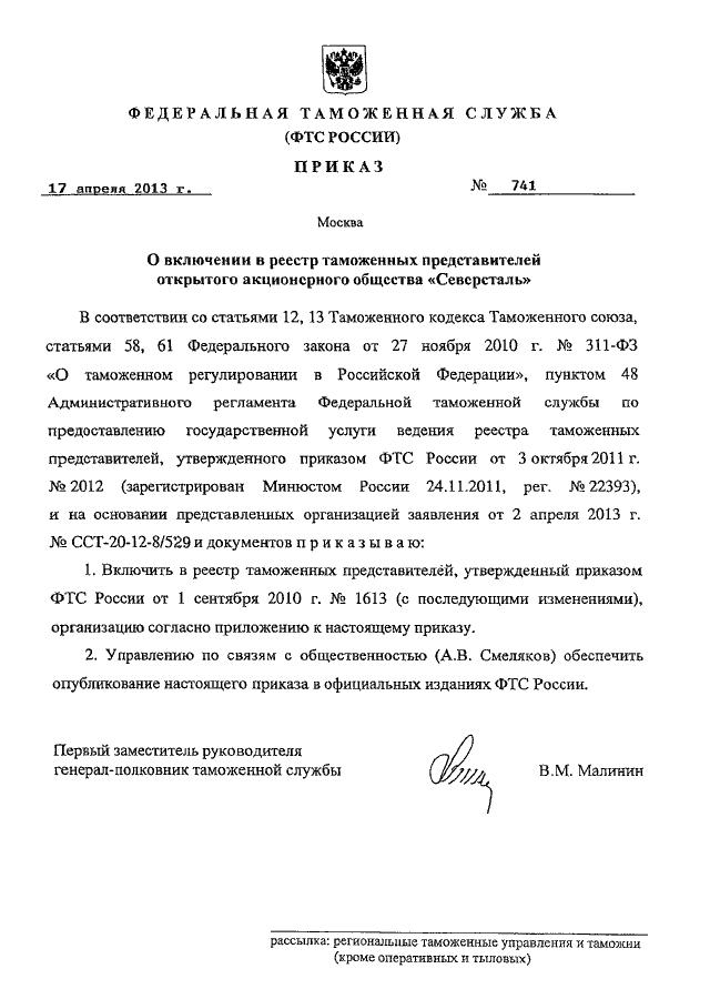 ПРИКАЗ ФТС РФ от 17.04.2013 N 741
