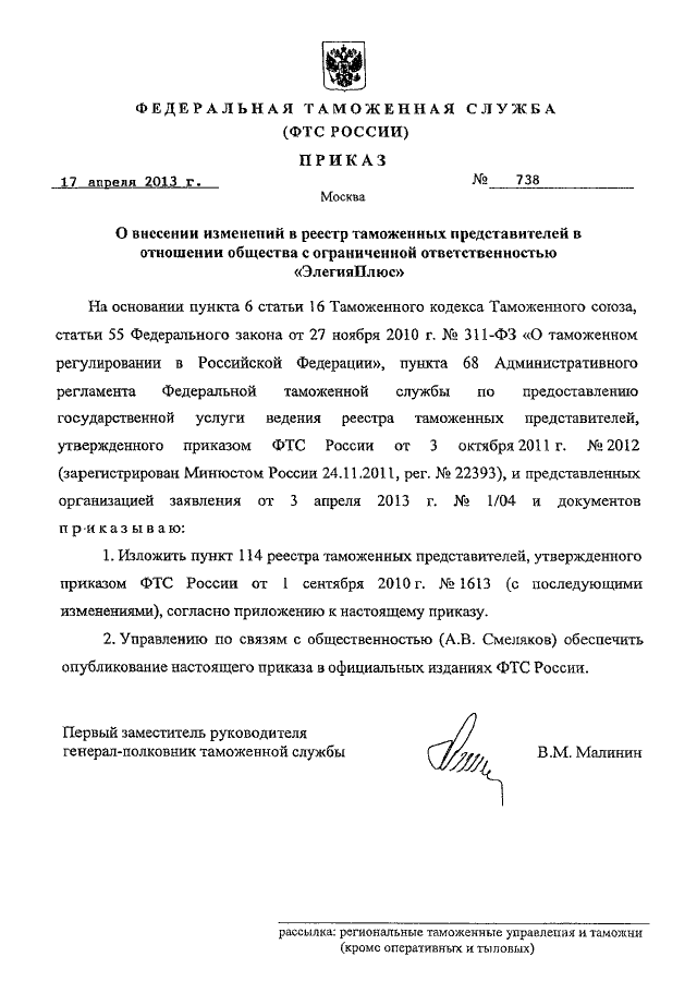 ПРИКАЗ ФТС РФ от 17.04.2013 N 738