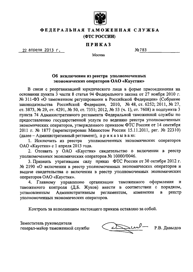 ПРИКАЗ ФТС РФ от 22.04.2013 N 783