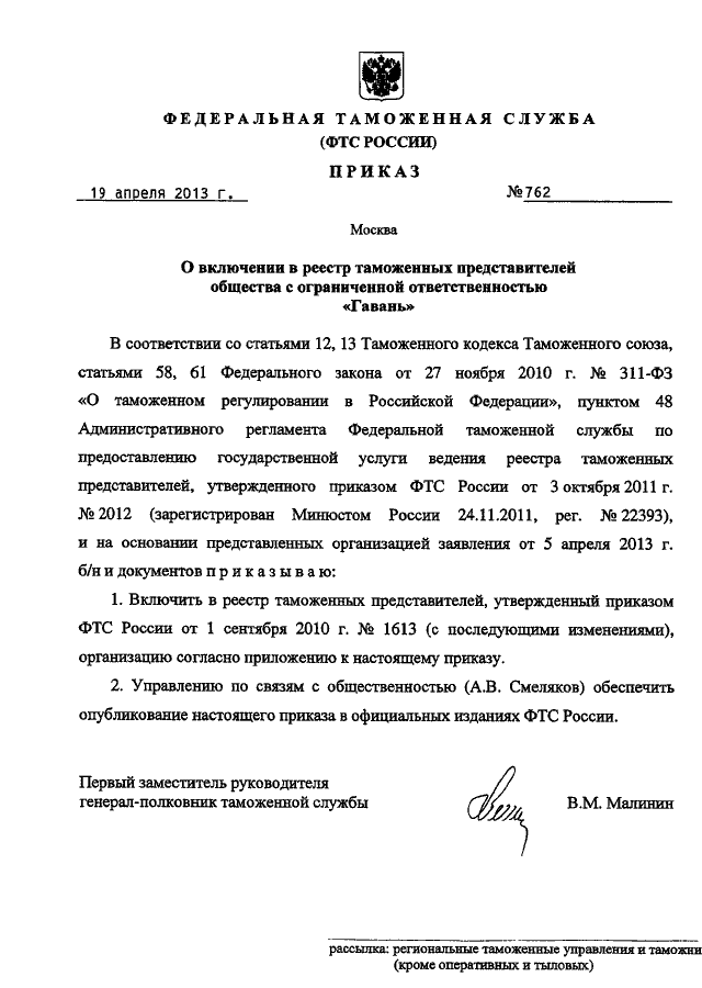 ПРИКАЗ ФТС РФ от 19.04.2013 N 762