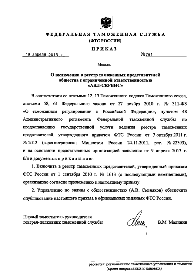 ПРИКАЗ ФТС РФ от 19.04.2013 N 761