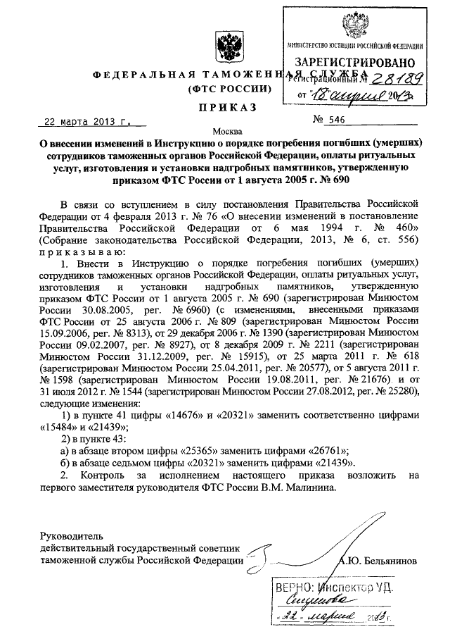 ПРИКАЗ ФТС РФ от 22.03.2013 N 546 "О ВНЕСЕНИИ ИЗМЕНЕНИЙ В ИНСТРУКЦИЮ О ПОРЯДКЕ ПОГРЕБЕНИЯ ПОГИБШИХ