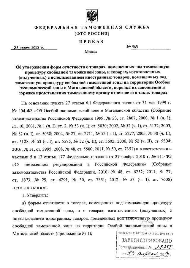 ПРИКАЗ ФТС РФ от 25.03.2013 N 565