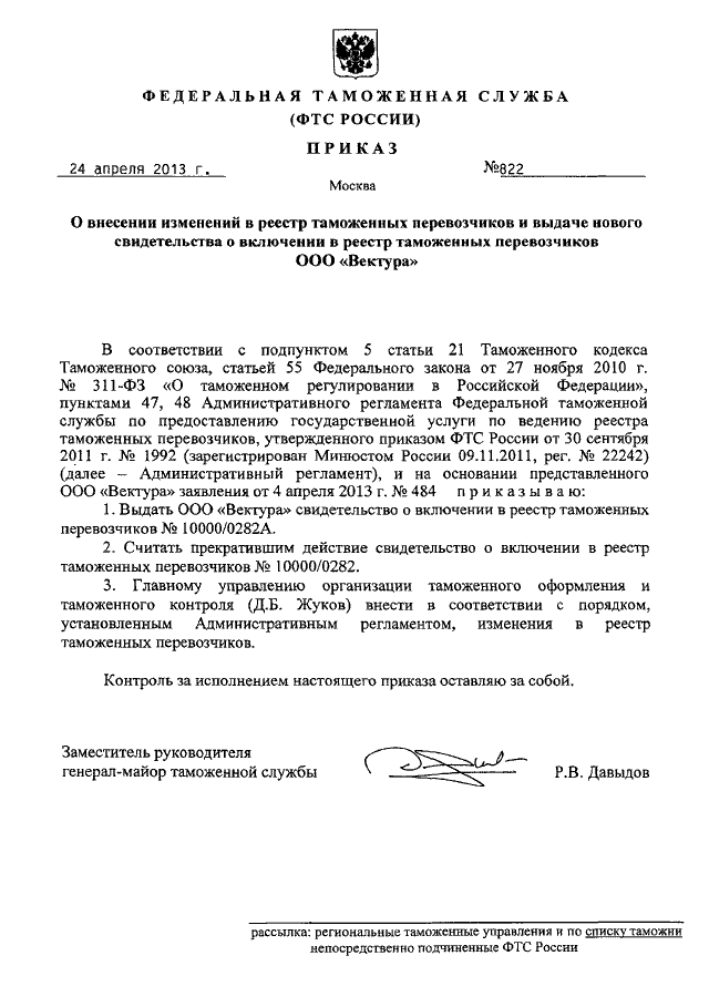 ПРИКАЗ ФТС РФ от 24.04.2013 N 822