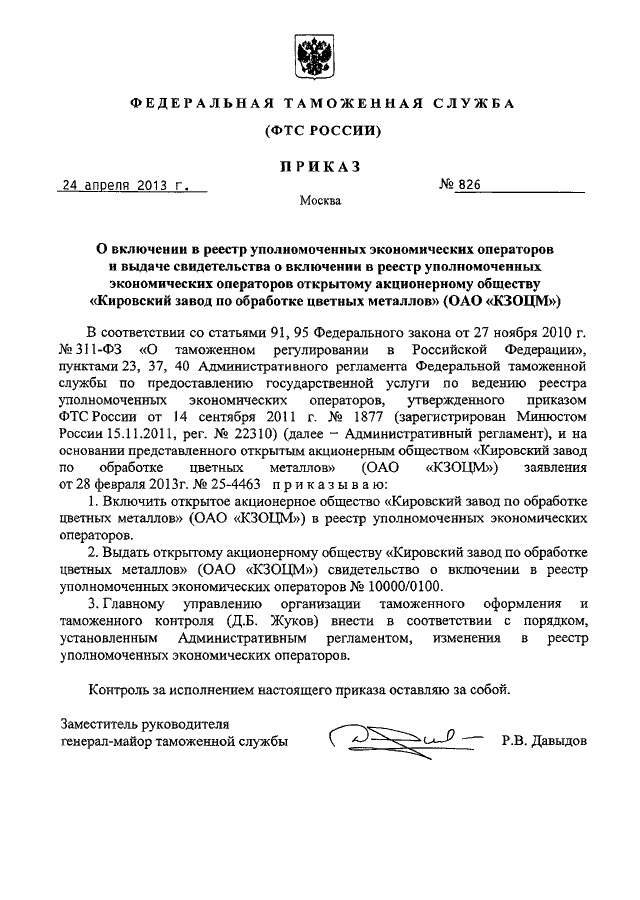 ПРИКАЗ ФТС РФ от 24.04.2013 N 826 "О ВКЛЮЧЕНИИ В РЕЕСТР УПОЛНОМОЧЕННЫХ ЭКОНОМИЧЕСКИХ ОПЕРАТОРОВ И