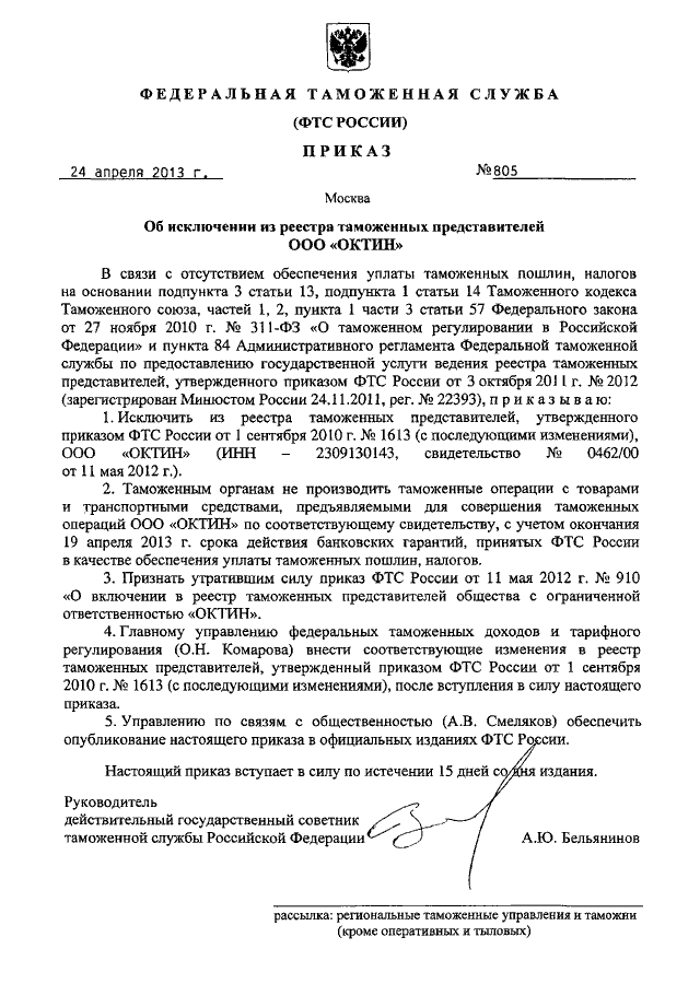 ПРИКАЗ ФТС РФ от 24.04.2013 N 805
