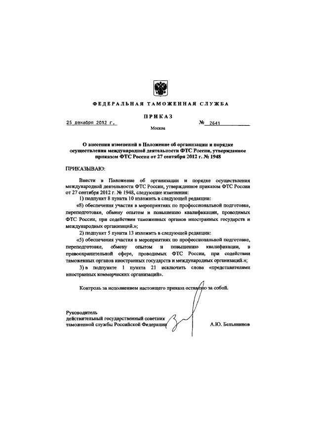 "О ВНЕСЕНИИ ИЗМЕНЕНИЙ В ПОЛОЖЕНИЕ ОБ ОРГАНИЗАЦИИ И ПОРЯДКЕ ОСУЩЕСТВЛЕНИЯ МЕЖДУНАРОДНОЙ ДЕЯТЕЛЬНОСТИ ФТС РОССИИ, УТВЕРЖДЕННОЕ ПРИКАЗОМ ФТС РОССИИ ОТ 27 СЕНТЯБРЯ 2012 Г. N 1948"