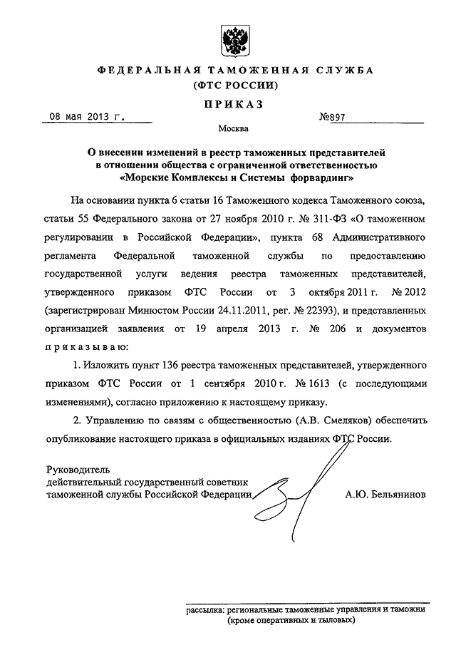 ПРИКАЗ ФТС РФ от 08.05.2013 N 897