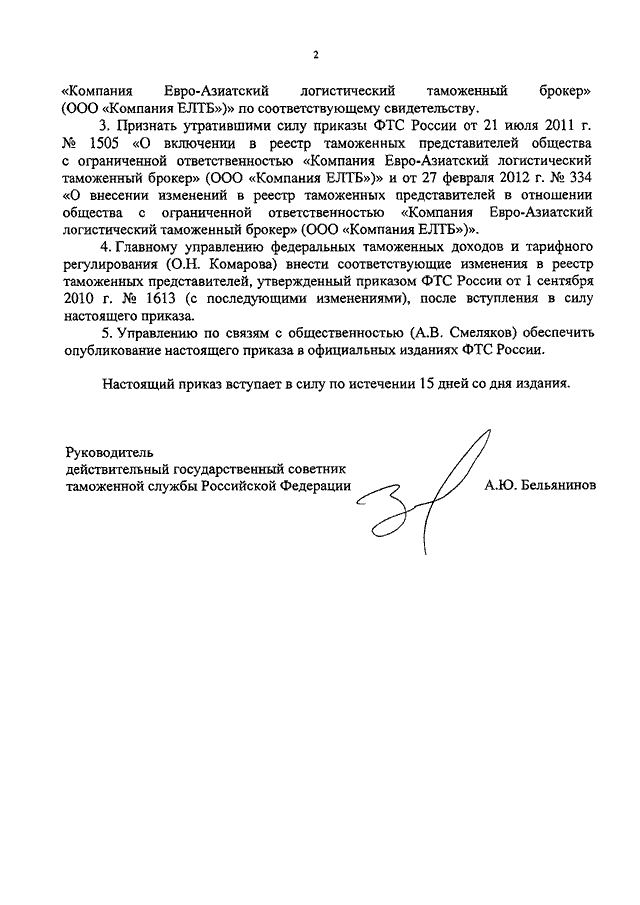 "ОБ ИСКЛЮЧЕНИИ ИЗ РЕЕСТРА ТАМОЖЕННЫХ ПРЕДСТАВИТЕЛЕЙ ОБЩЕСТВА С ОГРАНИЧЕННОЙ ОТВЕТСТВЕННОСТЬЮ "КОМПАНИЯ ЕВРО - АЗИАТСКИЙ ЛОГИСТИЧЕСКИЙ ТАМОЖЕННЫЙ БРОКЕР" (ООО "КОМПАНИЯ ЕЛТБ")"