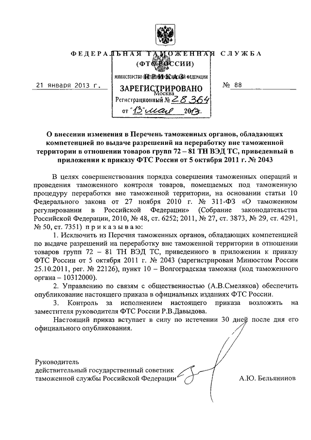 ПРИКАЗ ФТС РФ от 21.01.2013 N 88 "О ВНЕСЕНИИ ИЗМЕНЕНИЯ В ПЕРЕЧЕНЬ ТАМОЖЕННЫХ ОРГАНОВ, ОБЛАДАЮЩИХ