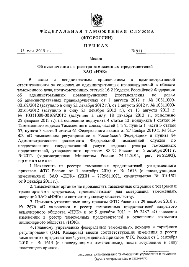 ПРИКАЗ ФТС РФ от 15.05.2013 N 911