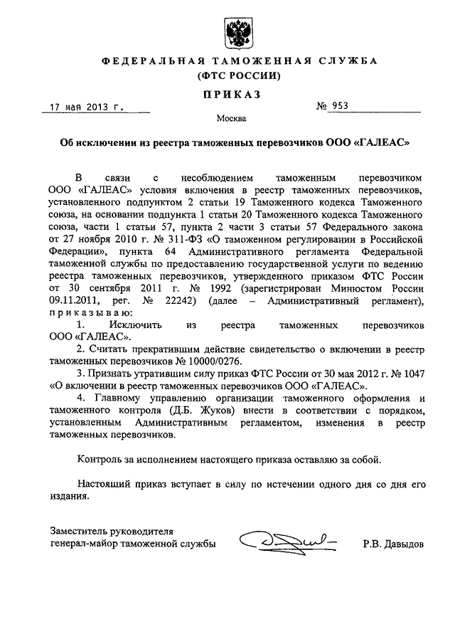 ПРИКАЗ ФТС РФ от 17.05.2013 N 953