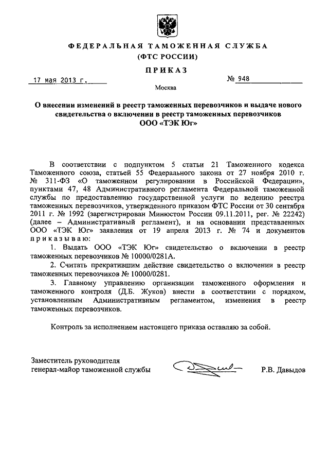 ПРИКАЗ ФТС РФ от 17.05.2013 N 948