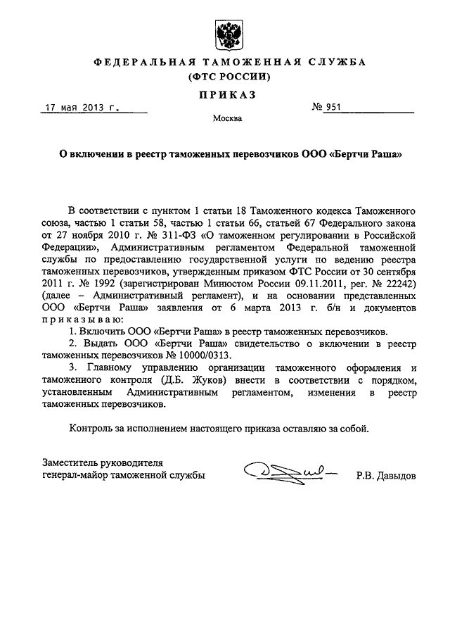 "О ВКЛЮЧЕНИИ В РЕЕСТР ТАМОЖЕННЫХ ПЕРЕВОЗЧИКОВ ООО "БЕРТЧИ РАША"
