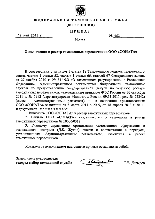 "О ВКЛЮЧЕНИИ В РЕЕСТР ТАМОЖЕННЫХ ПЕРЕВОЗЧИКОВ ООО "СОНАТА"