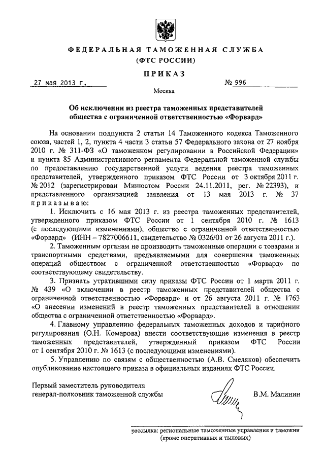 ПРИКАЗ ФТС РФ от 27.05.2013 N 996