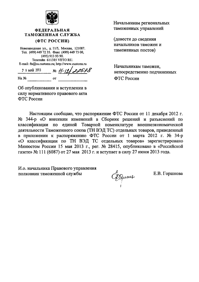 "ОБ ОПУБЛИКОВАНИИ И ВСТУПЛЕНИИ В СИЛУ НОРМАТИВНОГО ПРАВОВОГО АКТА ФТС РОССИИ"