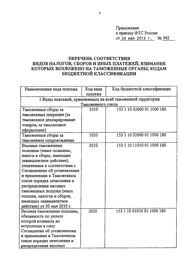 ПРИКАЗ ФТС РФ от 24.05.2013 N 982