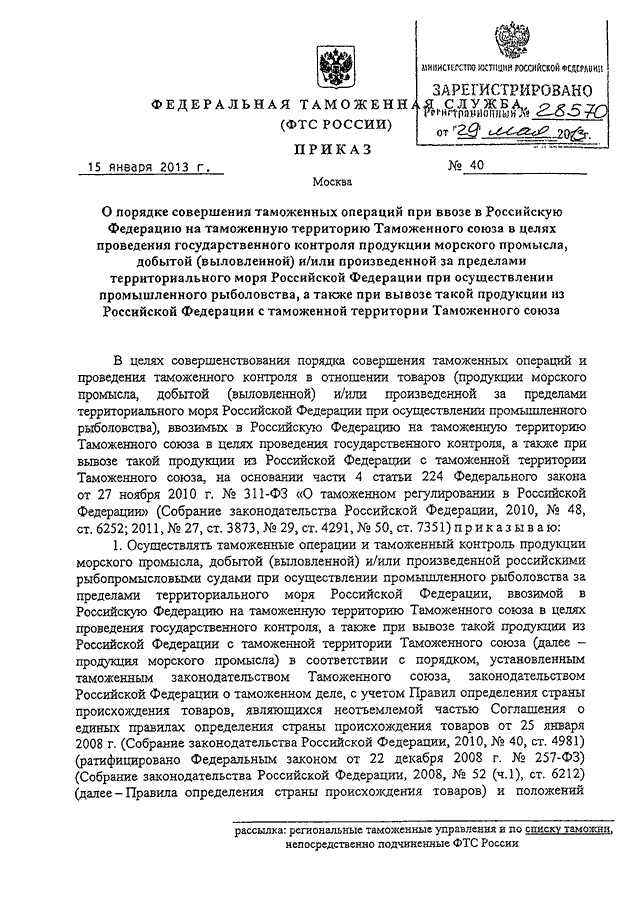 ПРИКАЗ ФТС РФ от 15.01.2013 N 40 "О ПОРЯДКЕ СОВЕРШЕНИЯ ТАМОЖЕННЫХ ОПЕРАЦИЙ ПРИ ВВОЗЕ В РОССИЙСКУЮ