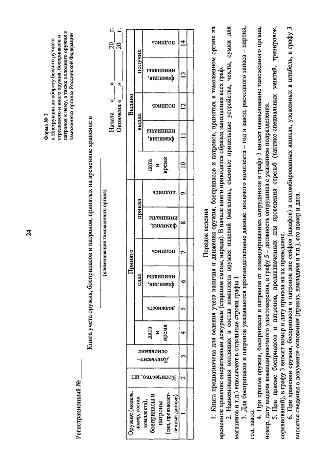 "ОБ УТВЕРЖДЕНИИ ИНСТРУКЦИИ ПО ОБОРОТУ БОЕВОГО РУЧНОГО СТРЕЛКОВОГО И ИНОГО ОРУЖИЯ, БОЕПРИПАСОВ И ПАТРОНОВ К НЕМУ, А ТАКЖЕ ХОЛОДНОГО ОРУЖИЯ В ТАМОЖЕННЫХ ОРГАНАХ РОССИЙСКОЙ ФЕДЕРАЦИИ"