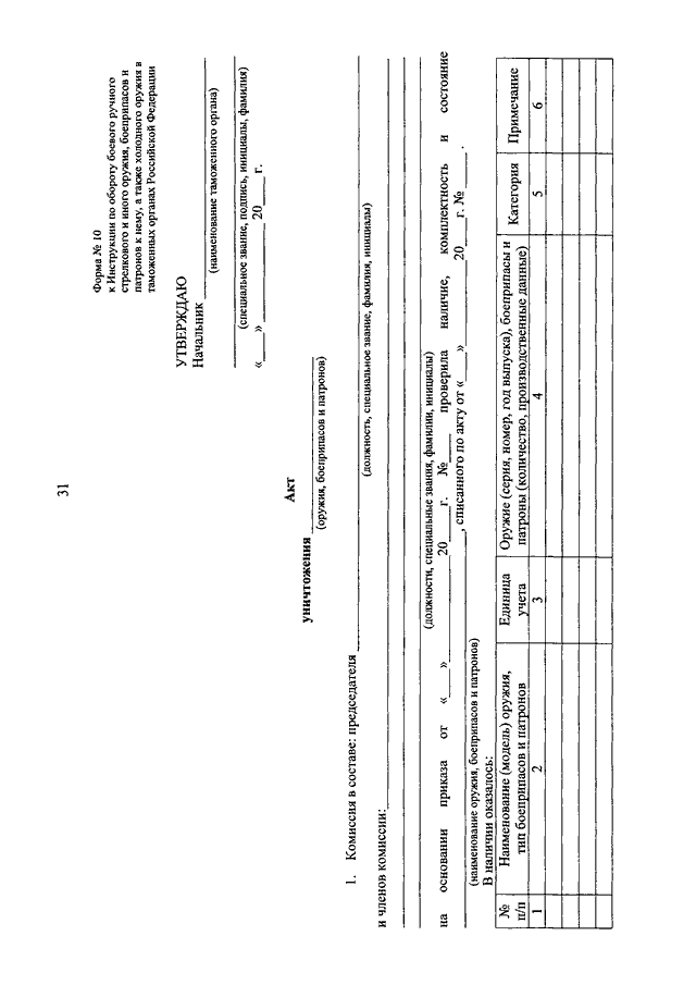 "ОБ УТВЕРЖДЕНИИ ИНСТРУКЦИИ ПО ОБОРОТУ БОЕВОГО РУЧНОГО СТРЕЛКОВОГО И ИНОГО ОРУЖИЯ, БОЕПРИПАСОВ И ПАТРОНОВ К НЕМУ, А ТАКЖЕ ХОЛОДНОГО ОРУЖИЯ В ТАМОЖЕННЫХ ОРГАНАХ РОССИЙСКОЙ ФЕДЕРАЦИИ"